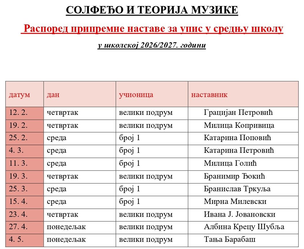 2. школско такмичење из солфеђа и теорије музике, 21. фебруар 2026.