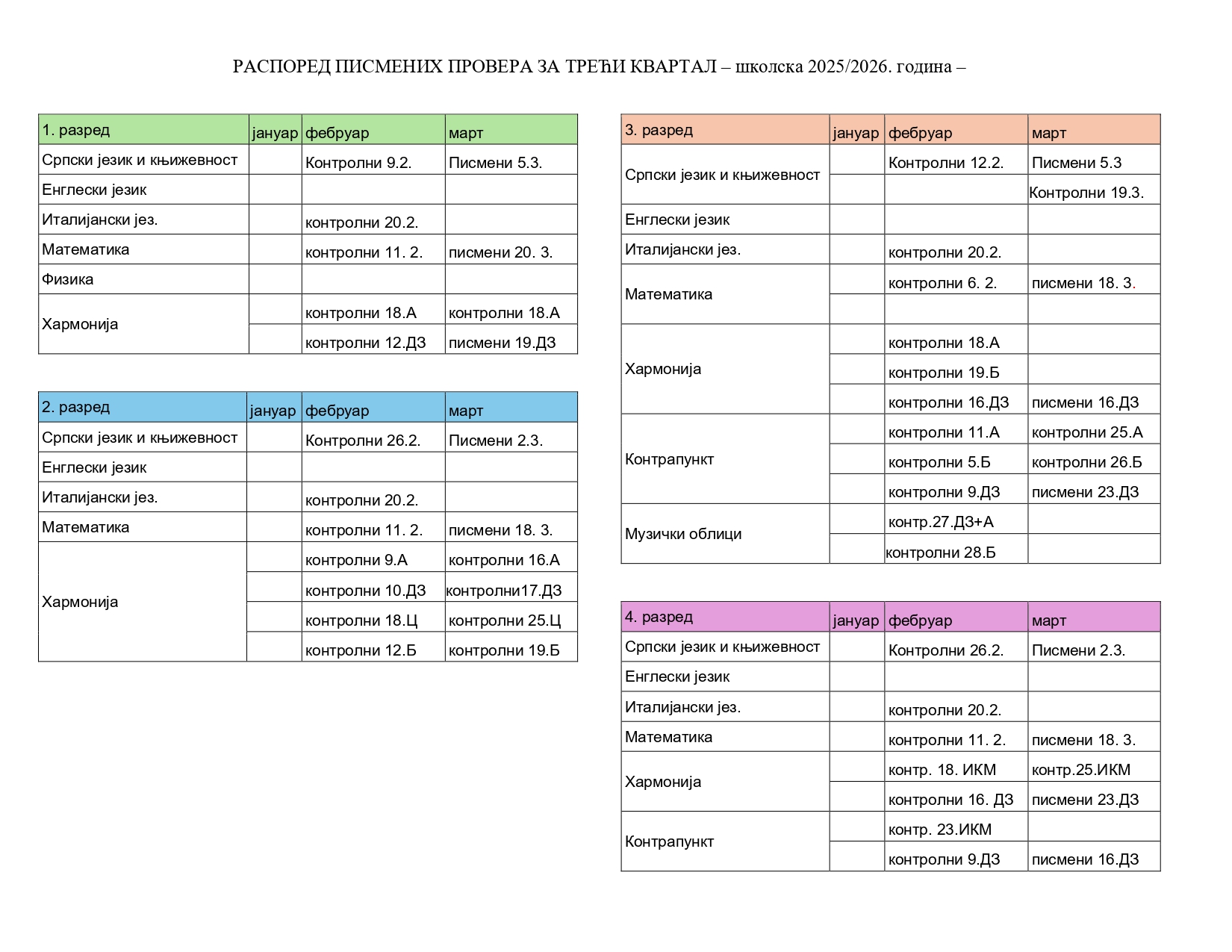Распоред писмених провера 2025/26.