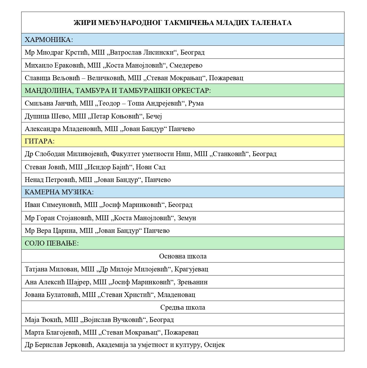 ЖИРИ 15. ТАКМИЧЕЊА "МИТА ТОПАЛОВИЋ" ЗА СОЛО ПЕВАЧЕ - основна школа